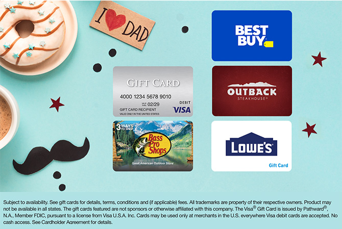 Sending a Father’s Day card? Add a card he’ll truly enjoy: a gift card for food, shopping, hobbies, or entertainment. Order now!